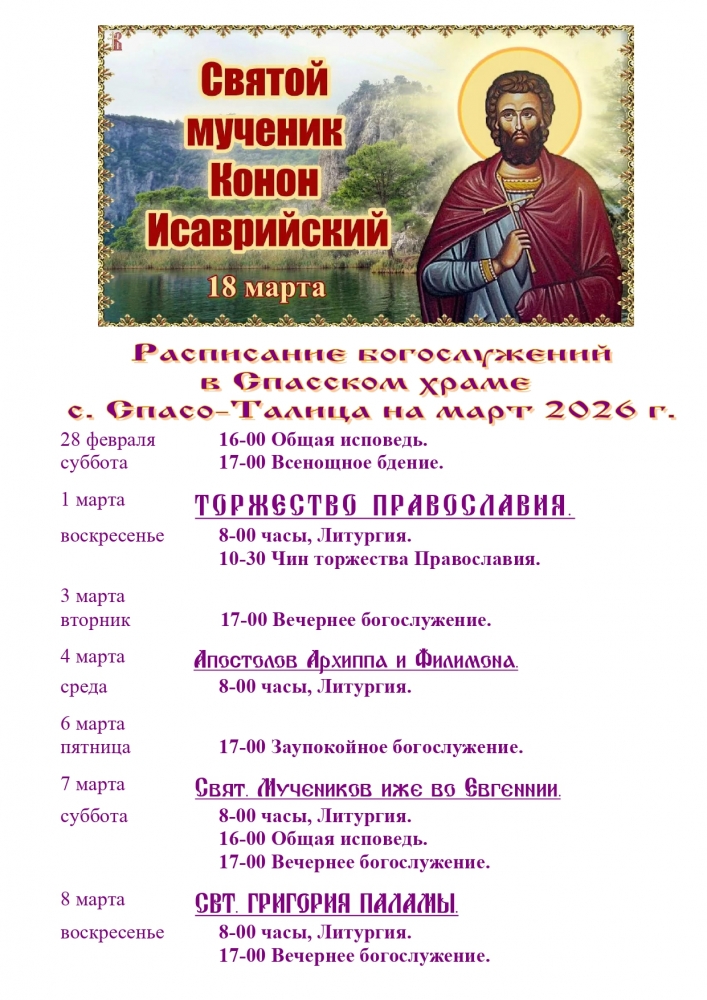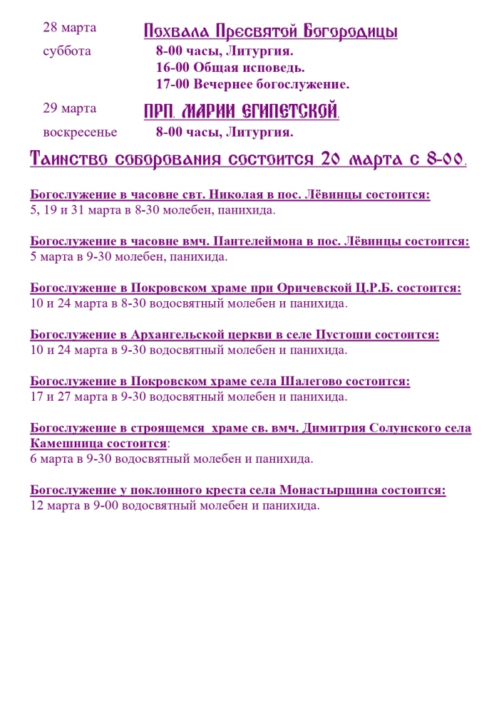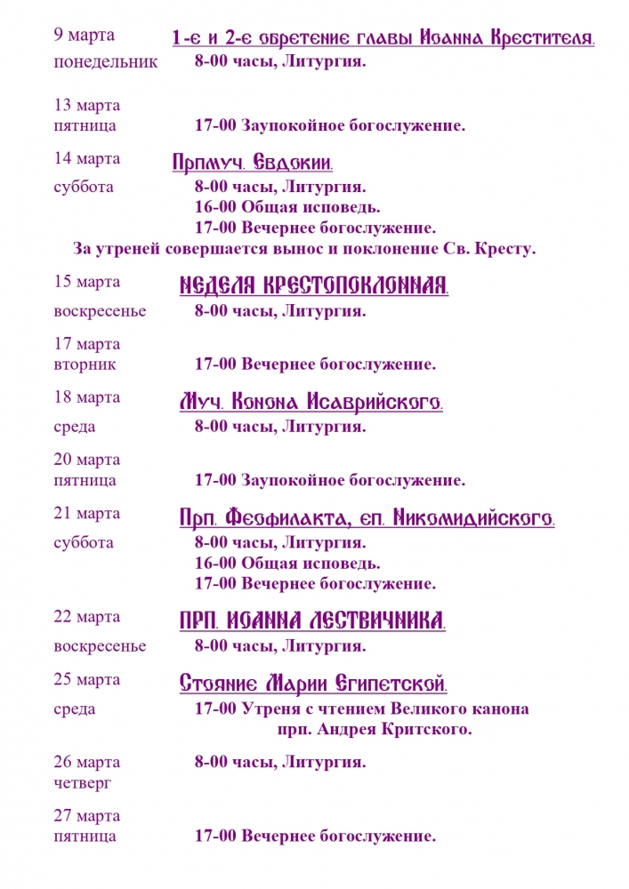 РАСПИСАНИЕ БОГОСЛУЖЕНИЙ